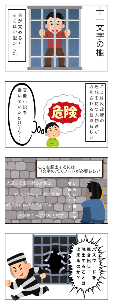 11文字のパスワードを解かない限り、監獄から脱出することはできない。ヒントはない。主人公はどうやって、正解を導くのだろうか?